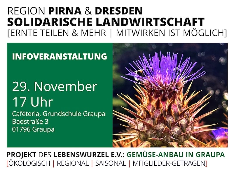 Wer Interesse an frischem, saisonalem und ökologisch erzeugtem Gemüse und anderen Lebensmitteln aus der Umgebung von Dresden/Pirna hat, ist bei der solidarischen Landwirtschaft (Solawi) „Gemüseanbau in Graupa“ genau richtig. Eine Anmeldung für die kommende Solawi-Saison ist ab November möglich.